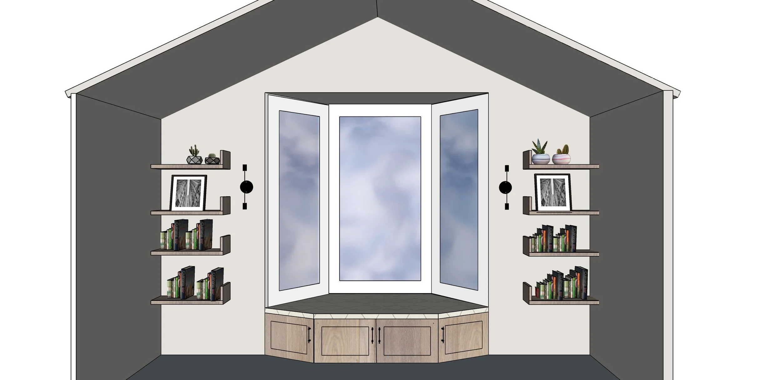 In designing the reading nook, I wanted to create a statement wall with reading and storage function. Thus, I designed a bench, some storage cabinets, a bay window flanked by floating shelves. I used InDesign and SketchUp for design sketches. Below is one of the many design options that I worked through.